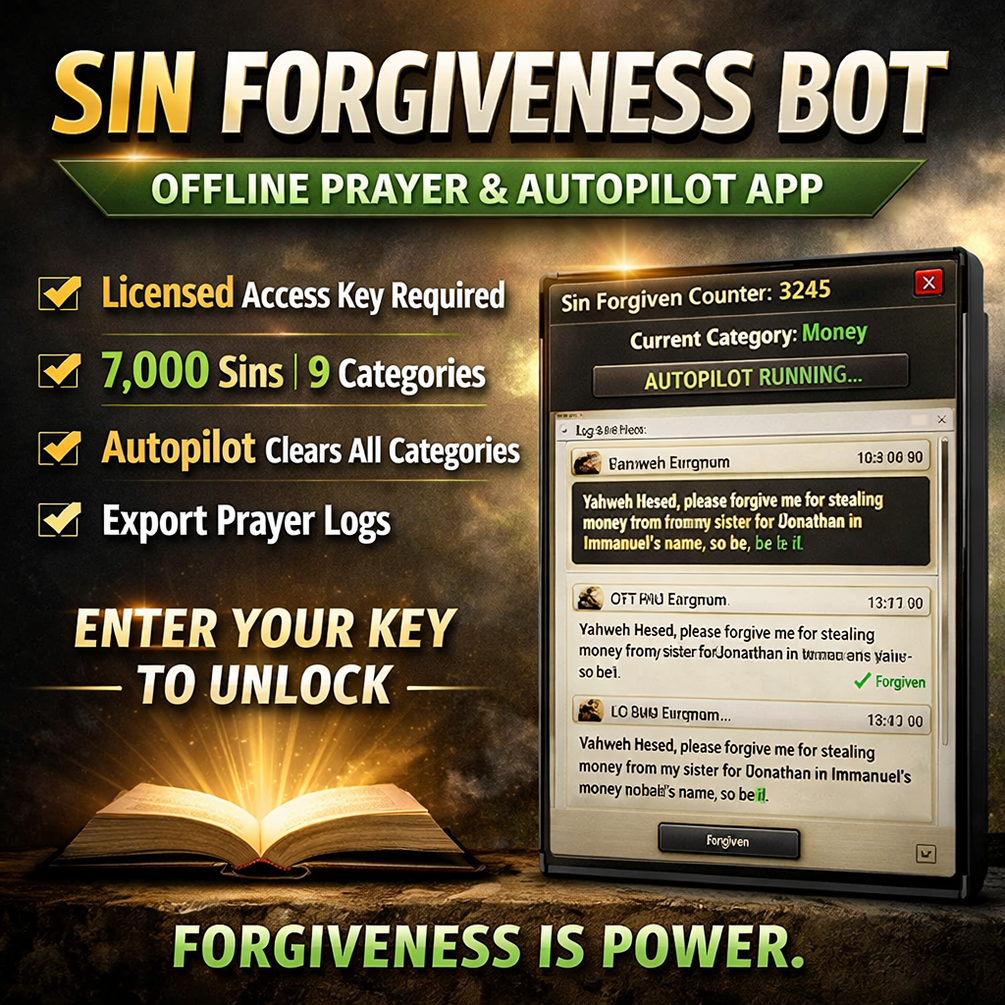 The Sin Forgiveness Bot is a locally-running, offline spiritual prayer tool that helps you confess, log, and release sins through structured forgiveness prayers — one sin at a time or fully automated with Autopilot Mode.